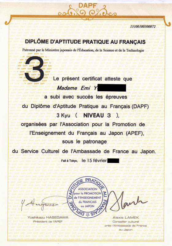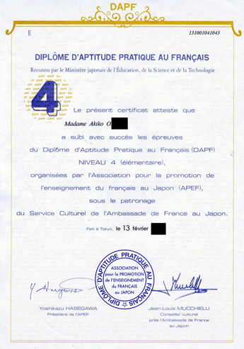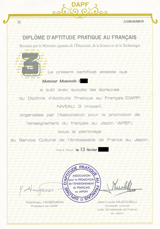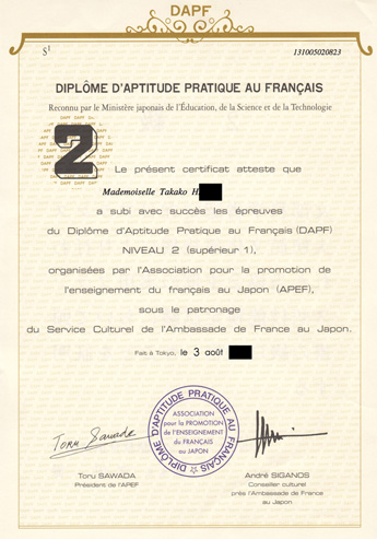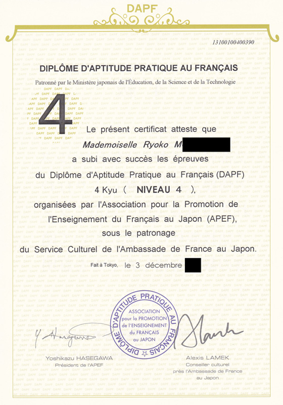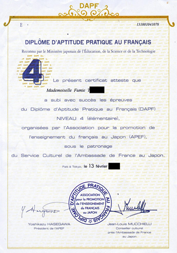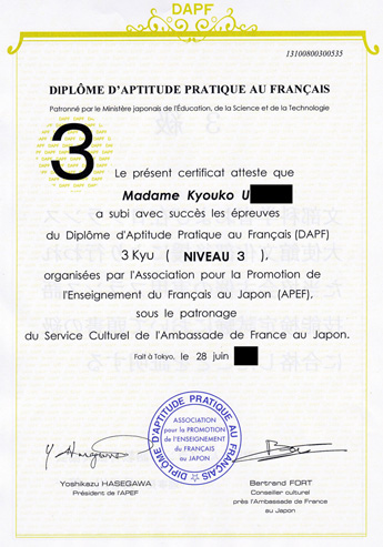 レッスンを受けて上達したみなさんが、フランス語の試験を受け合格しました。 今まで100人近くの方が合格いたしました。 その一部をご紹介します。