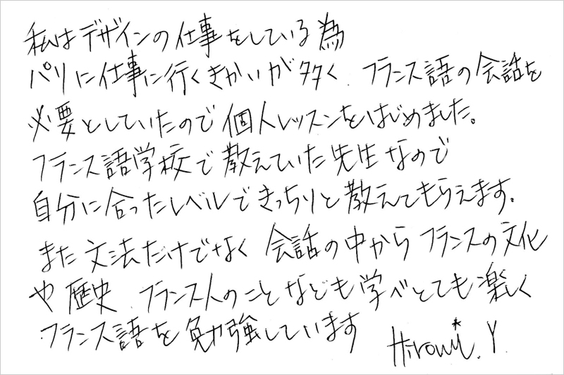 1対1でしっかり学べるプライベートレッスンです。 初めてフランス語を習う方から、フランスに留学・転勤する方まで あなたのレベルに合わせて、じっくりと学べるさまざまなコースをご用意しています。